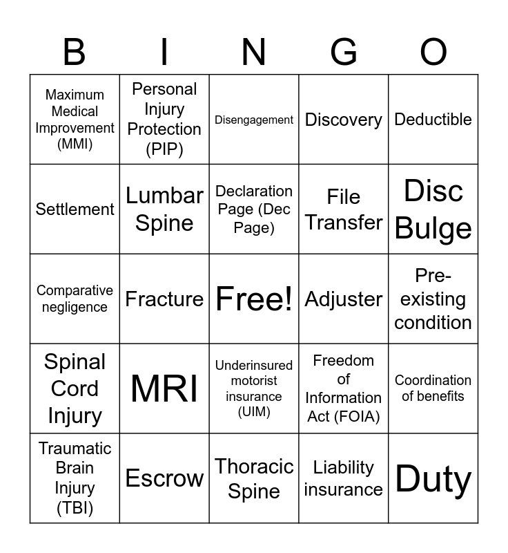This bingo card has a free space and 110 words: Actual cash value (ACV), Actual Notice, Adjuster, Adjustment, Annular Tear, Appraisal, Asset Check, Bad Faith, Breach, Catastrophic injury, Causation, Cervical Spine, Chiropractor, Coinsurance, Collateral Source Rule, Collision insurance, Comparative negligence, Conflicts, Constructive Notice, Contingency fee, Coordination of benefits, Copay, Coverage, CT Scan, Damages, Declaration Page (Dec Page), Deductible, Depreciation, Diminished value, Disbursement, Disc Bulge, Discovery, Disengagement, Disfigurement, Dislocation, Duty, Endorsement/Waiver, ERISA, Escrow, Examination Under Oath, Exclusion, Expert witness, File Transfer, Fracture, Freedom of Information Act (FOIA), Health Insurance (HI), Herniation, HIPAA –, HMO, Homeowners Insurance, Independent Medical Evaluation (IME), Letter of Protection (LOP), Liability insurance, Liability a.k.a Bodily Injury (BI), Lien, Litigation, Loss of Consortium, Loss of use, Lost Wages (LOW), Lumbar Spine, Maximum Medical Improvement (MMI), Medical malpractice, MedPay, Med-pay Exhaust, Modified Comparative Negligence, MRI, Negligence, Neurologist, No-fault insurance, Not related, Orthopaedic, Out-of-pocket maximum, Personal Injury Protection (PIP), PIP -Exhaust, Podiatrist, Policy limits, PPO, Pre-existing condition, Pre-Litigation, Primary Care Physician (PCP), Prior authorization, Product liability, Provider network, Recorded Statement, Reduction, Release, Rental, Replacement cost, Reservation of rights (ROR), Responsible Prudent Person, Salvage value, Settlement, Settlement Sheet, Spinal Cord Injury, Spoilation, Statute of limitations (SOL), Storage, Subrogation Analyst, Subrogation, Thoracic Spine, Timely Filing, Total loss (T/L), Towing, Traumatic Brain Injury (TBI), Underinsured motorist insurance (UIM), Uninsured motorist insurance (UM), Uninsured motorist PD (UMPD), Whiplash, Wrongful death and X-Ray.