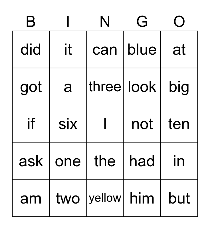 This bingo card has a free space and 24 words: one, two, three, am, at, did, got, it, not, the, look, if, had, in, a, him, ten, can, big, six, but, ask, blue and yellow.
