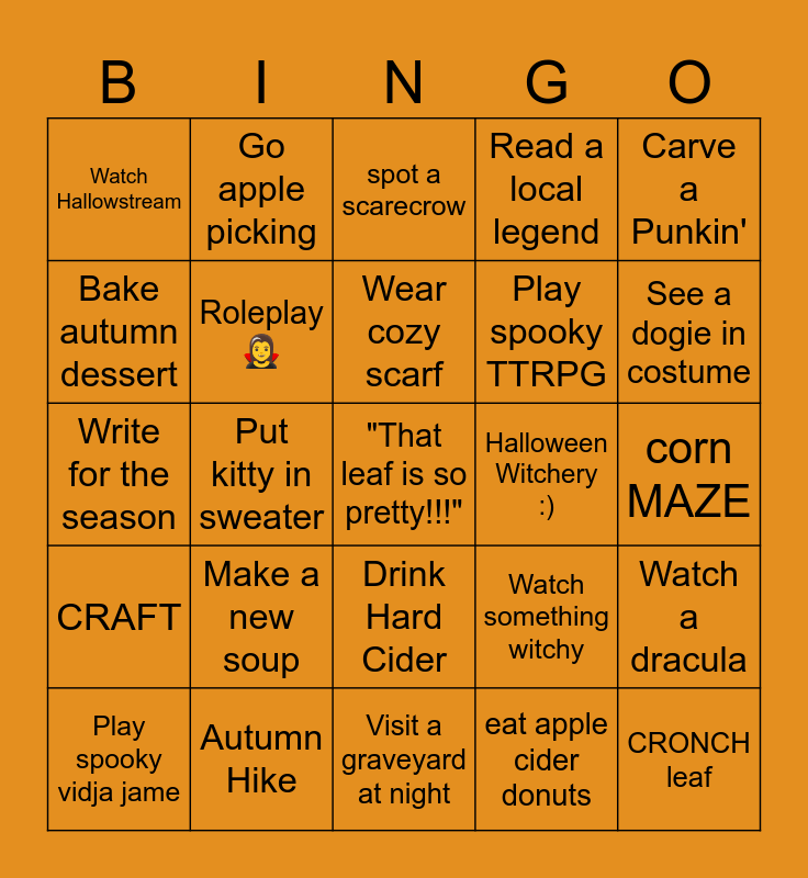 This bingo card has a free space and 24 words: Make a new soup, Autumn Hike, Wear cozy scarf, Play spooky vidja jame, Carve a Punkin', Watch Hallowstream, Bake autumn dessert, Go apple picking, Halloween Witchery :), Drink Hard Cider, Play spooky TTRPG, Write for the season, Watch something witchy, Watch a dracula, Roleplay 🧛♀️, eat apple cider donuts, corn MAZE, spot a scarecrow, See a dogie in costume, Put kitty in sweater, CRONCH leaf, CRAFT, Read a local legend and Visit a graveyard at night.