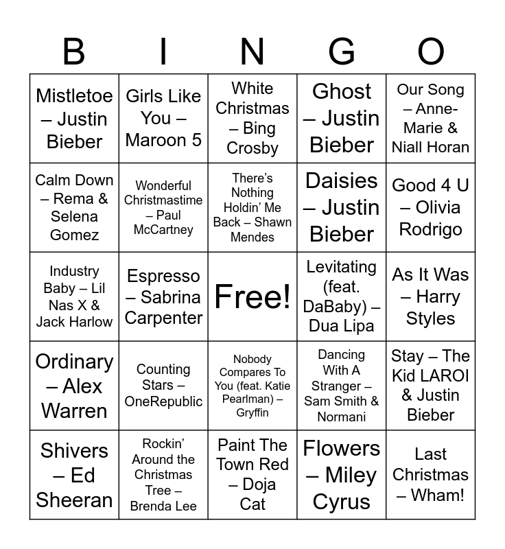 This bingo card has a free space and 40 words: Uptown Funk (feat. Bruno Mars) – Mark Ronson, Industry Baby – Lil Nas X & Jack Harlow, Man I Need – Olivia Dean, Wonderful Christmastime – Paul McCartney, Rockin’ Around the Christmas Tree – Brenda Lee, Nobody Compares To You (feat. Katie Pearlman) – Gryffin, There’s Nothing Holdin’ Me Back – Shawn Mendes, Closer (feat. Halsey) – The Chainsmokers, Our Song – Anne-Marie & Niall Horan, Ordinary – Alex Warren, Espresso – Sabrina Carpenter, Ghost – Justin Bieber, Last Christmas – Wham!, As It Was – Harry Styles, Levitating (feat. DaBaby) – Dua Lipa, Counting Stars – OneRepublic, No Tears Left To Cry – Ariana Grande, Mistletoe – Justin Bieber, Underneath the Tree – Kelly Clarkson, White Christmas – Bing Crosby, Stay – The Kid LAROI & Justin Bieber, Flowers – Miley Cyrus, Daisies – Justin Bieber, Calm Down – Rema & Selena Gomez, Anti-Hero – Taylor Swift, Santa Tell Me – Ariana Grande, Bad Habit – Steve Lacy, In It With You – JoJo & Craig David, Folded – Kehlani, Feliz Navidad – José Feliciano, I Got Better – Morgan Wallen, Shivers – Ed Sheeran, Fortnight (feat. Post Malone) – Taylor Swift, Dancing With A Stranger – Sam Smith & Normani, Good 4 U – Olivia Rodrigo, Paint The Town Red – Doja Cat, The Fate of Ophelia – Taylor Swift, All I Want For Christmas Is You – Mariah Carey, Girls Like You – Maroon 5 and Montero (Call Me By Your Name) – Lil Nas X.