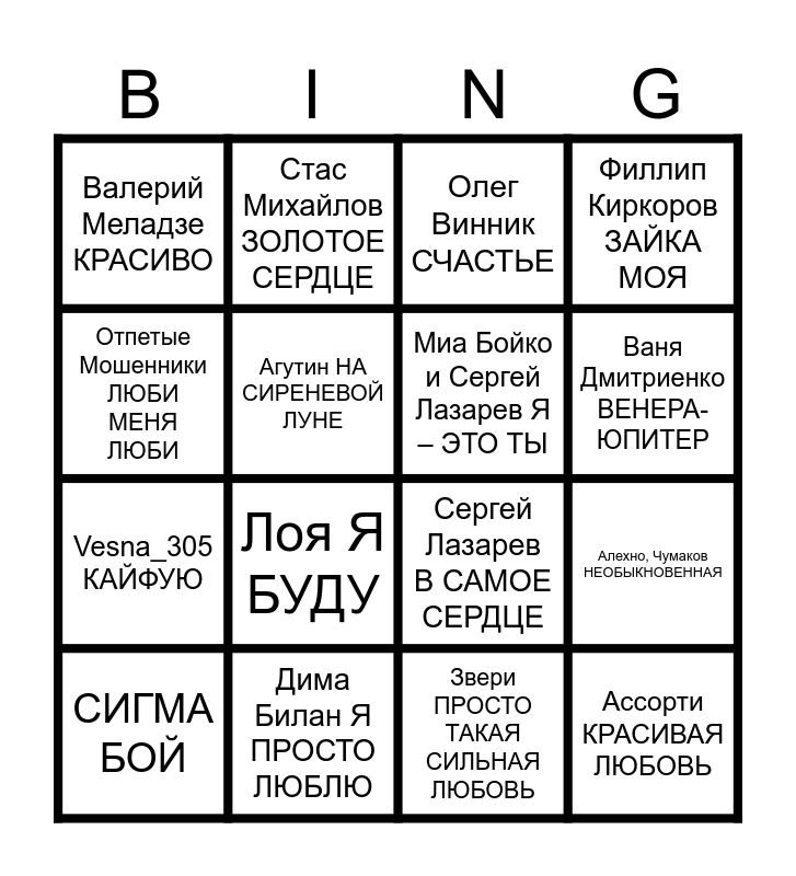 This bingo card has 27 words: Free!, Амирчик ЭТО ЛЮБОВЬ, Vesna_305 КАЙФУЮ, Синяя Птица КЛЁН, Агутин НА СИРЕНЕВОЙ ЛУНЕ, Олег Винник СЧАСТЬЕ, Стас Михайлов ЗОЛОТОЕ СЕРДЦЕ, Ассорти КРАСИВАЯ ЛЮБОВЬ, Дима Билан Я ПРОСТО ЛЮБЛЮ, Серов Я ЛЮБЛЮ ТЕБЯ ДО СЛЁЗ, Сергей Лазарев В САМОЕ СЕРДЦЕ, Филлип Киркоров ЗАЙКА МОЯ, Валентин Стрыкало НАШЕ ЛЕТО, Filatov & Karas feat.Masha ЛИРИКА, Лоя Я БУДУ, Ирина Аллегрова УГОНЩИЦА, Миа Бойко и Сергей Лазарев Я – ЭТО ТЫ, Ваня Дмитриенко ВЕНЕРА-ЮПИТЕР, Султан Лагучев ГОРЬКИЙ ВКУС, Валерий Меладзе КРАСИВО, Звери ПРОСТО ТАКАЯ СИЛЬНАЯ ЛЮБОВЬ, Фабрика ПРО ЛЮБОВЬ, Алехно, Чумаков НЕОБЫКНОВЕННАЯ, СИГМА БОЙ, Кравц, Гио Пика ГДЕ ПРОШЛА ТЫ, Отпетые Мошенники ЛЮБИ МЕНЯ ЛЮБИ and Гости из Будущего ЛЮБИ МЕНЯ ПО-ФРАНЦУЗСКИ.