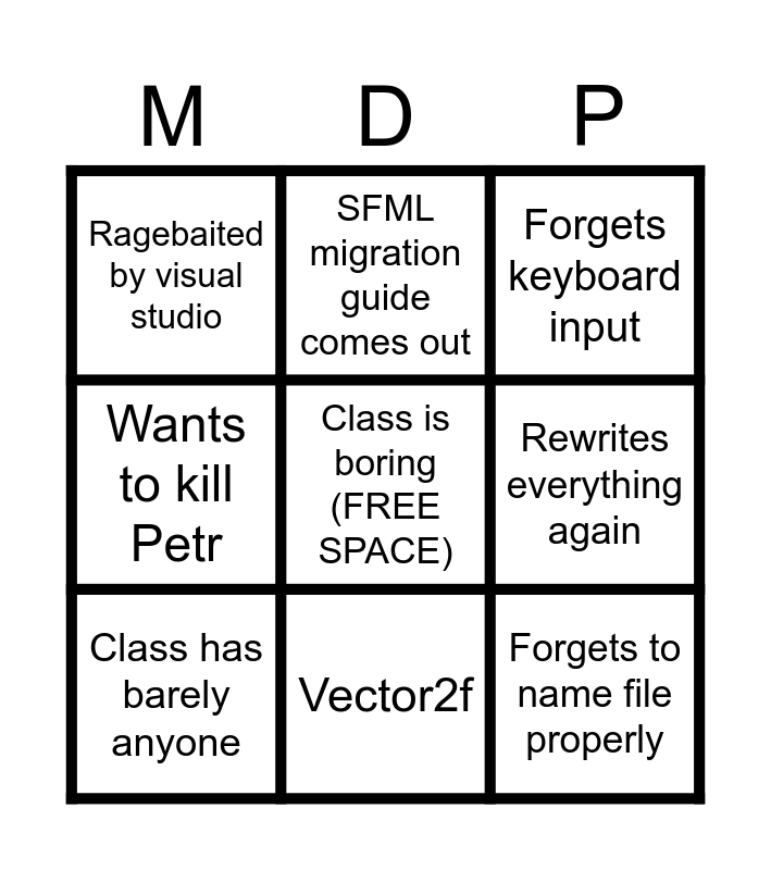 This bingo card has a free space and 10 words: Vector2f, Forgets keyboard input, Ragebaited by visual studio, Forgets to name file properly, Wants to kill Petr, Class has barely anyone, SFML migration guide comes out, Mentions "LLM's", Rewrites everything again and Class ends with major bug.
