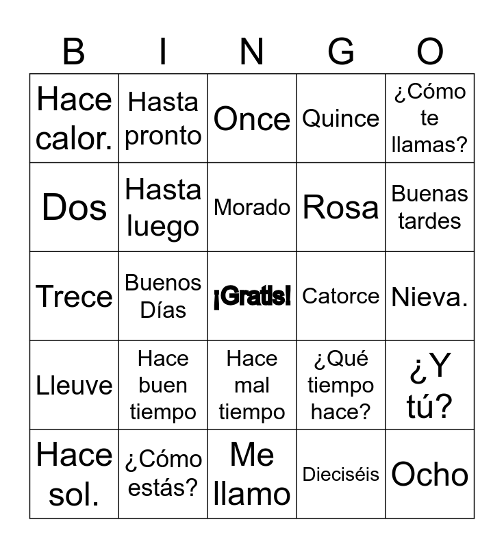 This bingo card has a free space and 29 words: Hace sol., Veinte, Buenos Días, Hace frío., Hace calor., Once, Hasta luego, Hace buen tiempo, Catorce, ¿Cómo estás?, Nieva., Ocho, Me llamo, Dieciséis, Buenas tardes, Hasta mañana, Hace mal tiempo, Lleuve, ¿Cómo te llamas?, Trece, ¿Qué tiempo hace?, Azul, Rosa, Dos, Quince, Hasta pronto, ¿Y tú?, Morado and ¡Hola!.