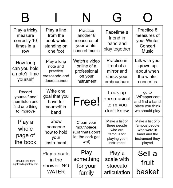 This bingo card has a free space and 24 words: Show someone how to hold your instrument, Play a scale in the shower. NO WATER, Watch a video online of a professional on your instrument, Read 3 lines from sightreadingfactory.com, Practice 8 measures of your Winter Concert Music, Play a tricky measure correctly 10 times in a row, How long can you hold a note? Time yourself, Play a line from the book while standing on one foot, Look up one musical term you don't know, Clean your mouthpiece. (Clarinets,don't let the cork get wet), Practice in front of a mirror and check your embouchure, Record yourself and then listen and find one thing to improve, Make a list of three people who are famous for playing your instrument, Make a list of 5 famous people who were in band and the instrument they played, Play a long note and practice crescendo and decrescendo, Play a scale with staccato articulation, go to JWPepper.com and find a band piece you think we should play, Practice another 8 measures of your winter concert music, Talk with your grown up about when the winter concert is, Write one goal that you have for yourself in band, Sell a fruit basket, Play a whole page of the book, Facetime a friend in band and play together and Play something for your family.