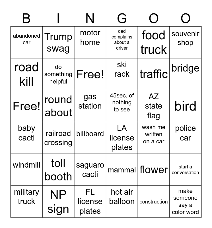 This bingo card has 36 words: mammal, saguaro cacti, hot air balloon, road kill, baby cacti, 45sec. of nothing to see, do something helpful, FL license plates, food truck, flower, bridge, dad complains about a driver, start a conversation, round about, ski rack, abandoned car, windmill, AZ state flag, Free!, motor home, gas station, railroad crossing, LA license plates, billboard, wash me written on a car, Trump swag, traffic, NP sign, Free!, souvenir shop, make someone say a color word, military truck, police car, bird, toll booth and construction.