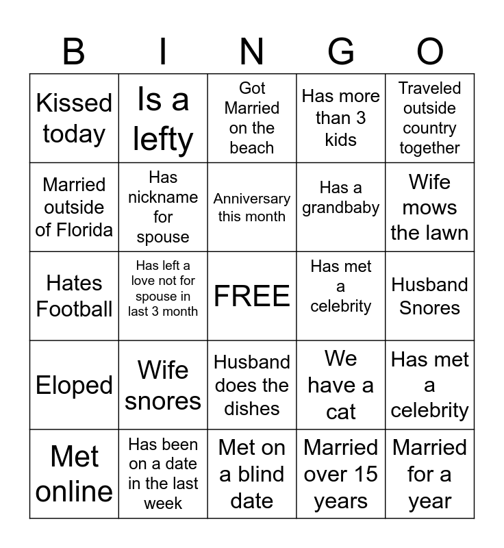 This bingo card has a free space and 29 words: Met online, We cook together, Has left a love not for spouse in last 3 month, We have a dog, Kissed today, Got Married on the beach, Has nickname for spouse, Wife snores, Has met a celebrity, Has been on a date in the last week, Husband Snores, Married for a year, Met on a blind date, Married over 15 years, Wife mows the lawn, We pray for each other, Husband does the dishes, Eloped, Traveled outside country together, Hates Football, We have a cat, Have matching t-shirts, Has a grandbaby, Married outside of Florida, Has more than 3 kids, Is a lefty, Has met a celebrity, Anniversary this month and Loves Football.