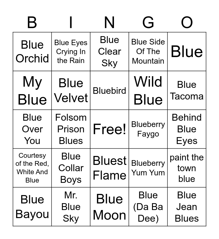 This bingo card has a free space and 34 words: Summertime Blues, Blue (Da Ba Dee), Blue on Black, Blue Monday, Courtesy of the Red, White And Blue, Blue Velvet, Blue, Blue Bayou, Blue Eyes Crying In the Rain, Blue Ain't Your Color, Bluebird, Blue Clear Sky, Blue Suede Shoes, Barefoot Blue Jean Night, Blueberry Faygo, Blue Tacoma, Mr. Blue Sky, Blue Over You, Blue Collar Boys, Blueberry Yum Yum, Bluest Flame, Blue Ridge Mountains, Blue Orchid, Behind Blue Eyes, Blue Moon, Blue Jean Blues, Blue Side Of The Mountain, Blueberry Hill, Wild Blue, My Blue, Bluer Than Blue, Folsom Prison Blues, paint the town blue and Roadhouse Blues.