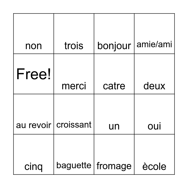This bingo card has 16 words: baguette, oui, bonjour, non, au revoir, trois, un, fromage, Free!, merci, cinq, amie/ami, croissant, deux, catre and ècole.