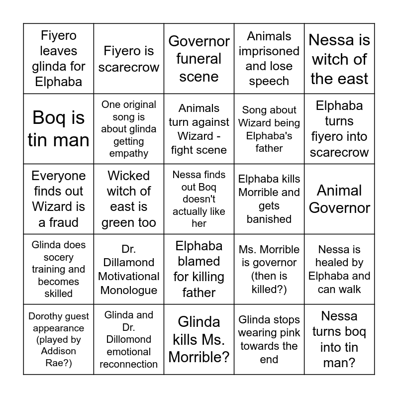 This bingo card has 25 words: Dr. Dillamond Motivational Monologue, Glinda kills Ms. Morrible?, Animals turn against Wizard - fight scene, Dorothy guest appearance (played by Addison Rae?), Nessa is witch of the east, Fiyero leaves glinda for Elphaba, Boq is tin man, Fiyero is scarecrow, Elphaba kills Morrible and gets banished, Elphaba blamed for killing father, Song about Wizard being Elphaba's father, Everyone finds out Wizard is a fraud, Ms. Morrible is governor (then is killed?), Nessa is healed by Elphaba and can walk, One original song is about glinda getting empathy, Nessa turns boq into tin man?, Animal Governor, Governor funeral scene, Elphaba turns fiyero into scarecrow, Wicked witch of east is green too, Nessa finds out Boq doesn't actually like her, Glinda and Dr. Dillomond emotional reconnection, Glinda does socery training and becomes skilled, Animals imprisoned and lose speech and Glinda stops wearing pink towards the end.