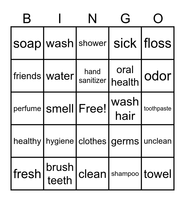 This bingo card has a free space and 29 words: handwash, brush teeth, shower, deodorant, floss, soap, water, hand sanitizer, wash hair, unclean, fresh, smell, shampoo, towel, perfume, cologne, clean, germs, odor, healthy, hygiene, infection, oral health, toothpaste, friends, wash, clothes, sick and sanitary.
