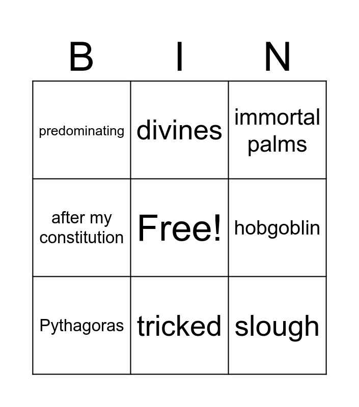 This bingo card has a free space and 12 words: the absolutely trustworthy, suffrage, slough, hobgoblin, divines, immortal palms, tricked, meanness, predominating, after my constitution, Pythagoras and connate.