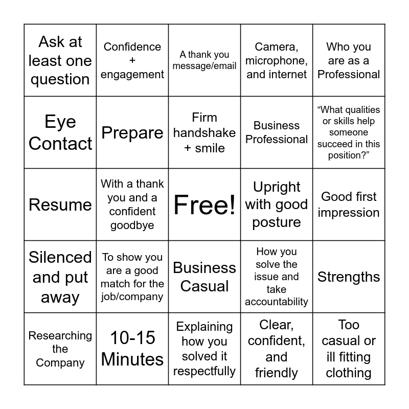 This bingo card has a free space and 24 words: To show you are a good match for the job/company, 10-15 Minutes, Firm handshake + smile, Researching the Company, Who you are as a Professional, Ask at least one question, Eye Contact, Confidence + engagement, Upright with good posture, Business Casual, Business Professional, Resume, How you solve the issue and take accountability, Strengths, Prepare, Clear, confident, and friendly, Good first impression, A thank you message/email, “What qualities or skills help someone succeed in this position?”, With a thank you and a confident goodbye, Too casual or ill fitting clothing, Silenced and put away, Camera, microphone, and internet and Explaining how you solved it respectfully.