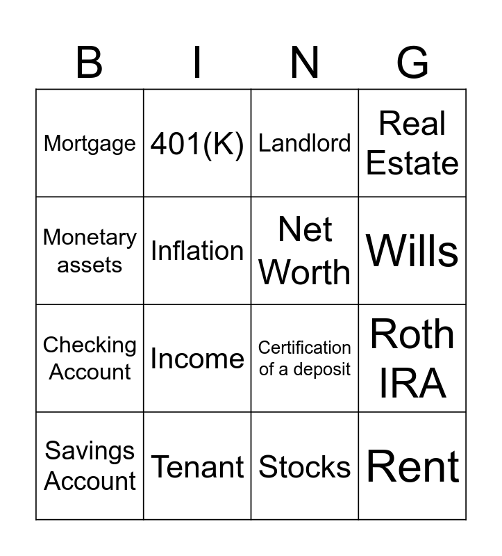 This bingo card has 20 words: Roth IRA, Statement of financial position, Landlord, Deflation, Savings Account, Monetary assets, Tenant, Mortgage, Checking Account, 401(K), Income, Certification of a deposit, Inflation, Rent, Net Worth, Money Maker Account, Wills, Real Estate, Stocks and Leasing.