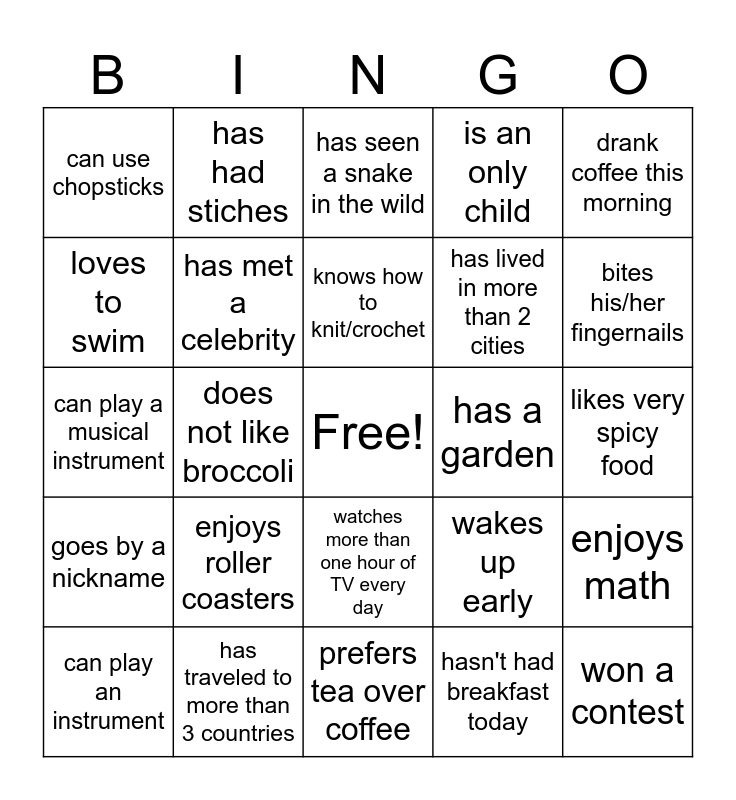 This bingo card has a free space and 42 words: was both in the same month as you, knows how to knit/crochet, has a pet that isn't a cat or dog, enjoys roller coasters, hasn't had breakfast today, enjoys math, won a contest, is a couch potato, has seen a snake in the wild, watches more than one hour of TV every day, likes very spicy food, bites his/her fingernails, does not like broccoli, drank coffee this morning, is afraid of spiders, wakes up early, wears socks to bed, can play a musical instrument, has fainted or thrown up in public, has had stiches, loves to swim, has the most letters in their last name, who has more than four siblings, can use chopsticks, can whistle, has a November birthday, has lived in more than 2 cities, is vegetarian/vegan, doesn't use social media, owns a motorcycle, has read more than 5 books this year, goes by a nickname, has met a celebrity, prefers tea over coffee, has worked here 25+ years, can play an instrument, has traveled to more than 3 countries, has a garden, has hiked on the Appalachian Trail, is a middle child, is an only child and is left-handed.