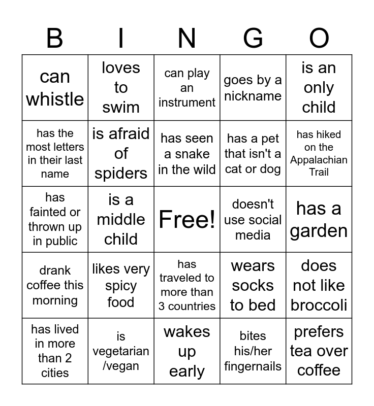 This bingo card has a free space and 42 words: is a couch potato, has seen a snake in the wild, watches more than one hour of TV every day, likes very spicy food, bites his/her fingernails, does not like broccoli, prefers tea over coffee, has worked here 25+ years, can play an instrument, has traveled to more than 3 countries, has a garden, has hiked on the Appalachian Trail, is a middle child, is an only child, is left-handed, wears socks to bed, can play a musical instrument, has fainted or thrown up in public, has had stiches, loves to swim, has the most letters in their last name, who has more than four siblings, can use chopsticks, can whistle, was both in the same month as you, knows how to knit/crochet, has a pet that isn't a cat or dog, enjoys roller coasters, hasn't had breakfast today, enjoys math, won a contest, drank coffee this morning, is afraid of spiders, wakes up early, has a November birthday, has lived in more than 2 cities, is vegetarian /vegan, doesn't use social media, owns a motorcycle, has read more than 5 books this year, goes by a nickname and has met a celebrity.