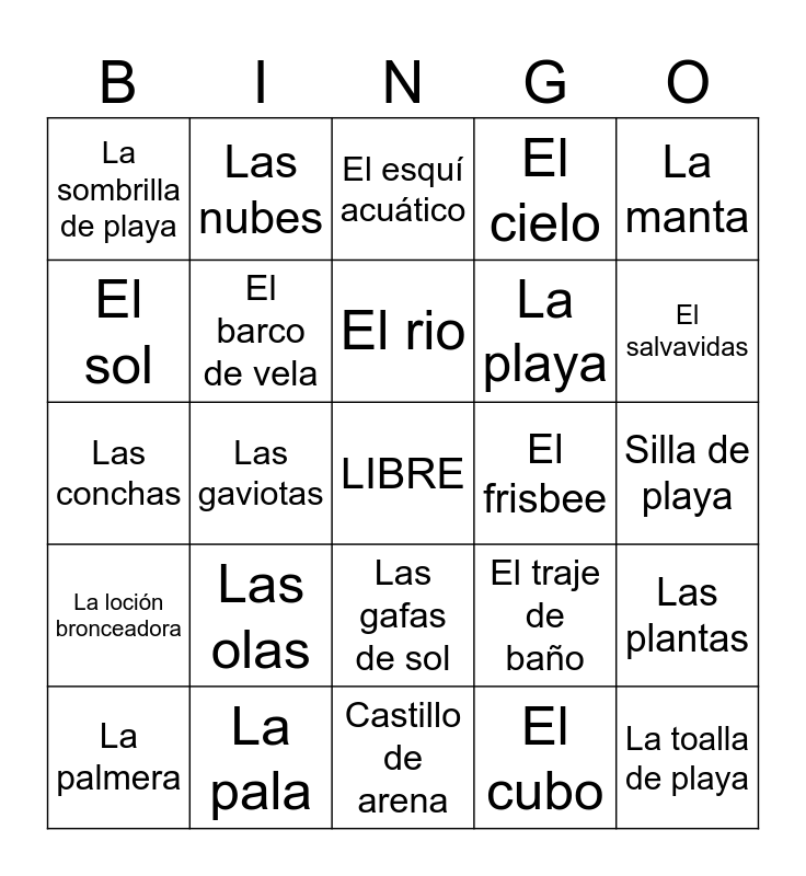This bingo card has a free space and 29 words: La palmera, El faro, Las gaviotas, La salvavidas, La sombrilla de playa, El esquí acuático, El barco de vela, Las olas, El frisbee, La pala, Silla de playa, La toalla de playa, Castillo de arena, El cubo, El salvavidas, La arena, Las gafas de sol, La loción bronceadora, La manta, Las conchas, El traje de baño, El colchón flotante de aire, La playa, El sol, El cielo, Las nubes, Las plantas, El rio and El lago.