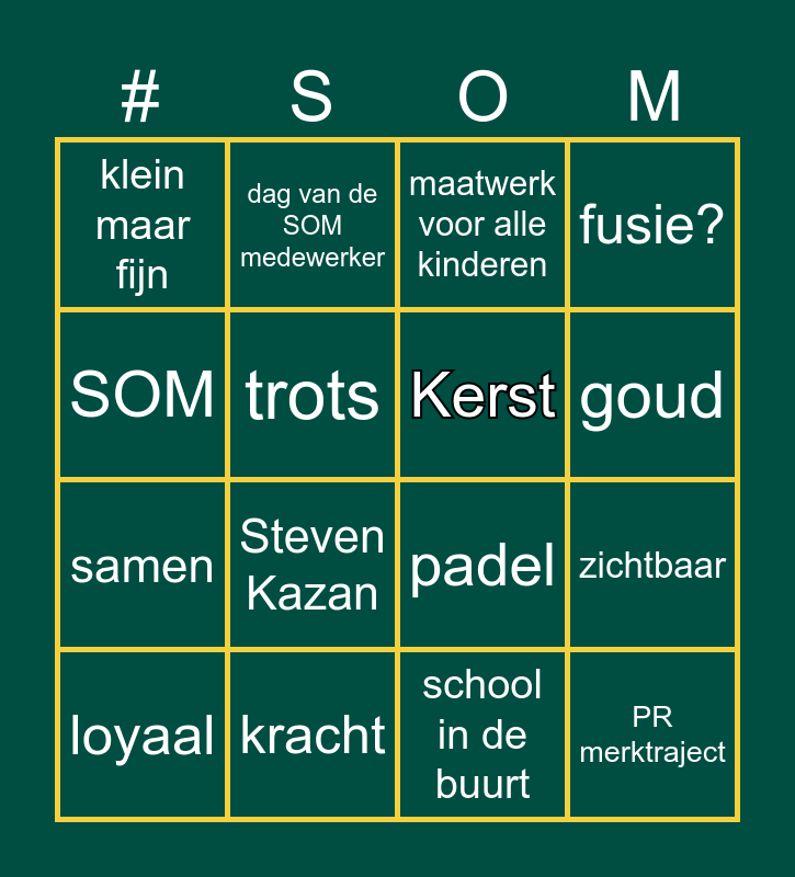 This bingo card has 16 words: kracht, zichtbaar, maatwerk voor alle kinderen, klein maar fijn, samen, dag van de SOM medewerker, padel, school in de buurt, SOM, trots, loyaal, fusie?, Steven Kazan, goud, Kerst and PR merktraject.
