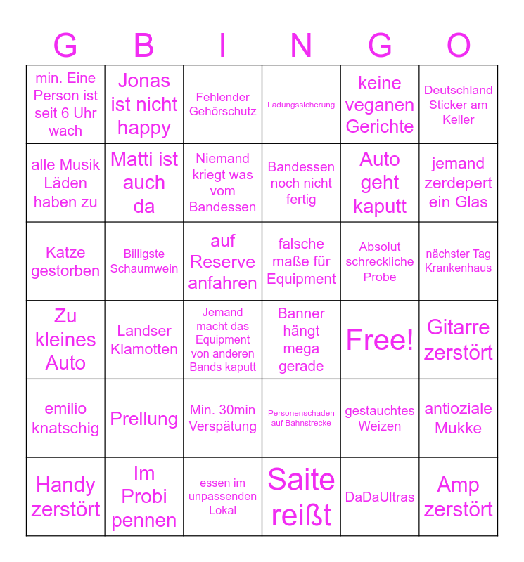 This bingo card has 36 words: Personenschaden auf Bahnstrecke, Min. 30min Verspätung, Saite reißt, alle Musik Läden haben zu, Zu kleines Auto, falsche maße für Equipment, Matti ist auch da, essen im unpassenden Lokal, keine veganen Gerichte, gestauchtes Weizen, jemand zerdepert ein Glas, Ladungssicherung, antioziale Mukke, Billigste Schaumwein, Bandessen noch nicht fertig, min. Eine Person ist seit 6 Uhr wach, emilio knatschig, Absolut schreckliche Probe, Katze gestorben, Fehlender Gehörschutz, auf Reserve anfahren, Landser Klamotten, Banner hängt mega gerade, Jemand macht das Equipment von anderen Bands kaputt, Free!, Jonas ist nicht happy, Auto geht kaputt, Im Probi pennen, Niemand kriegt was vom Bandessen, Deutschland Sticker am Keller, Amp zerstört, Handy zerstört, Gitarre zerstört, nächster Tag Krankenhaus, Prellung and DaDaUltras.
