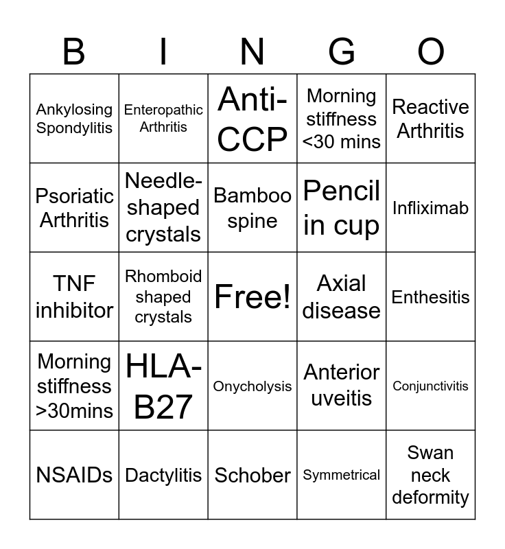 This bingo card has a free space and 24 words: HLA-B27, Dactylitis, Bamboo spine, NSAIDs, Reactive Arthritis, Ankylosing Spondylitis, Psoriatic Arthritis, Enteropathic Arthritis, Axial disease, Onycholysis, Pencil in cup, TNF inhibitor, Anterior uveitis, Conjunctivitis, Needle-shaped crystals, Symmetrical, Enthesitis, Anti-CCP, Infliximab, Rhomboid shaped crystals, Swan neck deformity, Morning stiffness >30mins, Morning stiffness <30 mins and Schober.