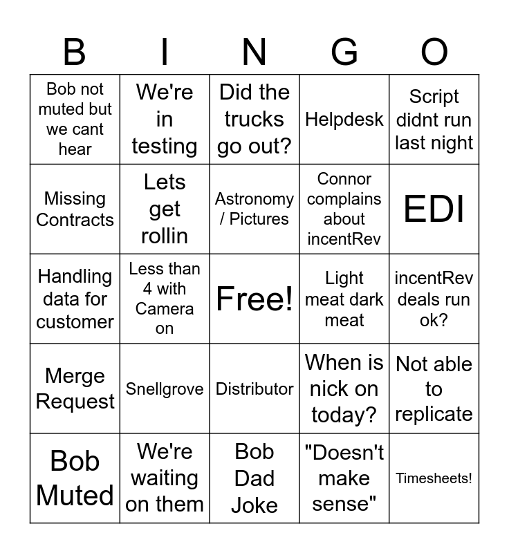 This bingo card has a free space and 56 words: Weather Chat, Bob Muted, Marshall Muted, Bob not muted but we cant hear, Bob Dad Joke, Alrighty Then, Lets get rollin, Chicken Problem, Connor complains about incentRev, Call us if you need us, Helpdesk, USDA, Gordon foods, Who has PTO, Tom story, Party Planning Committee, Script didnt run last night, Less than 4 with Camera on, More than 4 with Camera on, Timesheets!, Light meat dark meat, Hear people in background, When is nick on today?, Did the trucks go out?, "XX stay on after this call", Astronomy / Pictures, Audio Issues, Customer being crazy, EDI, Hop on another call, Somebody eating, What else we got?, Marshall security update, Anything else?, incentRev deals run ok?, Missing Contracts, Handling data for customer, Ill forward you that email, Merge Request, We're in testing, Distributor, Invoices, Premier, Blackbaud, Tickets, Snellgrove, We're waiting on them, Yardy, Widget, Waiting on the data to load, "Doesn't make sense", Schedule a meeting, 855s, Price File, Not able to replicate and Landed Errors.