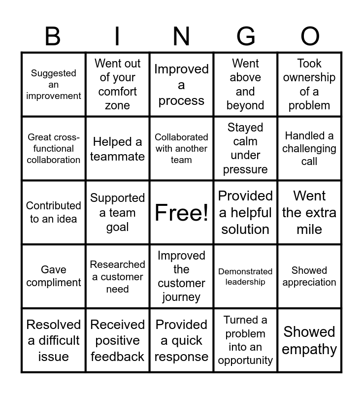 This bingo card has a free space and 24 words: Researched a customer need, Received positive feedback, Collaborated with another team, Resolved a difficult issue, Took ownership of a problem, Suggested an improvement, Great cross-functional collaboration, Went out of your comfort zone, Provided a helpful solution, Improved the customer journey, Stayed calm under pressure, Contributed to an idea, Demonstrated leadership, Showed appreciation, Helped a teammate, Turned a problem into an opportunity, Went the extra mile, Improved a process, Handled a challenging call, Supported a team goal, Showed empathy, Gave compliment, Went above and beyond and Provided a quick response.