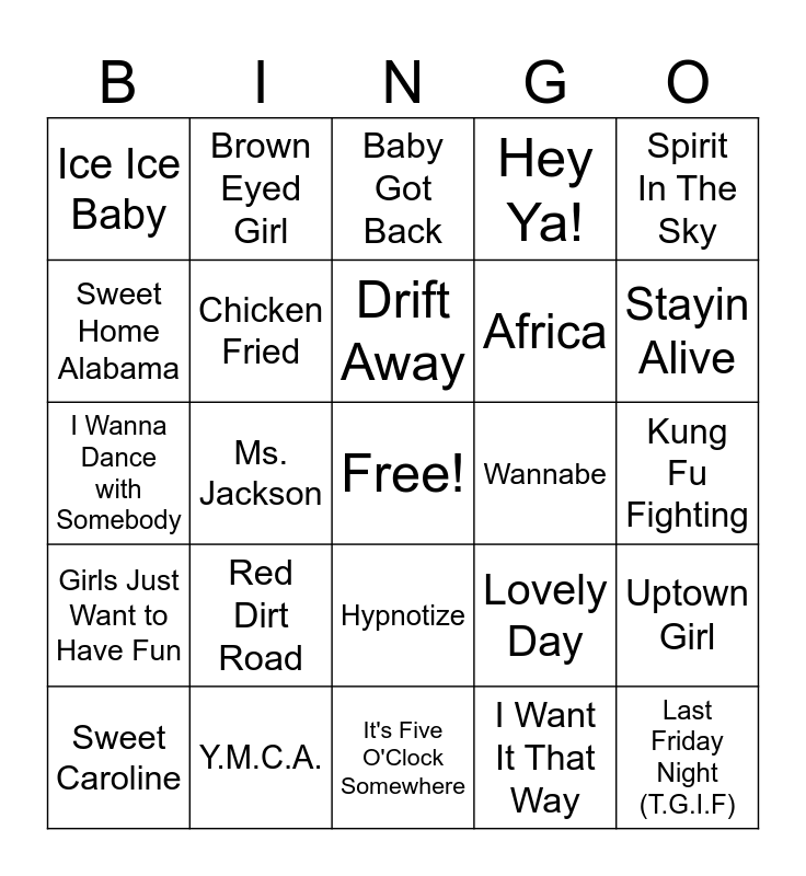 This bingo card has a free space and 59 words: Never Gonna Give You Up, Y.M.C.A., Take on Me, Girls Just Want to Have Fun, I Want It That Way, TiK ToK, Chicken Fried, All Star, Africa, Eye of the Tiger, Hey Ya!, People Are Crazy, Sweet Home Alabama, You Shook Me All Night Long, Don't Worry Be Happy, Ice Ice Baby, Last Friday Night (T.G.I.F), Spirit In The Sky, Old Time Rock & Roll, Drift Away, Wannabe, Baby Got Back, Sweet Caroline, Uptown Girl, Walking On Sunshine, We Will Rock You, Hit Me With Your Best Shot, U Can't Touch This, Stayin Alive, Uptown Funk, You Give Love A Bad Name, Wake Me Up Before You Go-Go, Wonderwall, Lose Yourself, Brown Eyed Girl, Celebration, You're The One That I Want, Ms. Jackson, Take Me Home, Country Roads, I Wanna Dance with Somebody, Good Vibrations, Red Dirt Road, Kung Fu Fighting, I'll Be There For You, Any Way You Want It, Rock with You, Summer Of '69, Bad Reputation, Hypnotize, It's Five O'Clock Somewhere, Cherry Pie, Sweet Child O'Mine, Gin and Juice, Come On Eileen, Party In The U.S.A., Lovely Day, Accidentally In Love, Sharp Dressed Man and Rockstar.