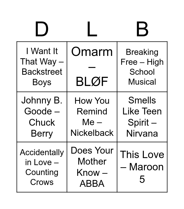 This bingo card has 41 words: Sinds 1 Dag of 2 – Doe Maar, Uptown Funk – Mark Ronson ft. Bruno Mars, Kryptonite – 3 Doors Down, Accidentally in Love – Counting Crows, One Way or Another – One Direction, Use Somebody – Kings of Leon, Does Your Mother Know – ABBA, Kilby Girl – The Backseat Lovers, How You Remind Me – Nickelback, Iedereen Is van de Wereld – The Scene, Teenage Dirtbag – Wheatus, Johnny B. Goode – Chuck Berry, Girl – Anouk, You Give Love a Bad Name – Bon Jovi, Sexy Als Ik Dans – Nielson, Colors – Black Pumas, Dancing in the Dark – Bruce Springsteen, I Want It That Way – Backstreet Boys, Hold the Line – Toto, Breaking Free – High School Musical, Zombie – The Cranberries, Chelsea Dagger – The Fratellis, Stil in Mij – Van Dik Hout, This Love – Maroon 5, Life Is a Highway – Rascal Flatts, Don't – Ed Sheeran, Love Story – Taylor Swift, Purple Rain – Prince, Summer of ’69 – Bryan Adams, Take On Me – a-ha, Basket Case – Green Day, Omarm – BLØF, Born to Be Wild – Steppenwolf, What’s Up? – 4 Non Blondes, Play That Funky Music – Wild Cherry, Smells Like Teen Spirit – Nirvana, Twist and Shout – The Beatles, Runaway Baby – Bruno Mars, Unwritten – Natasha Bedingfield, I Wish – Stevie Wonder and Narcotic – Liquido.