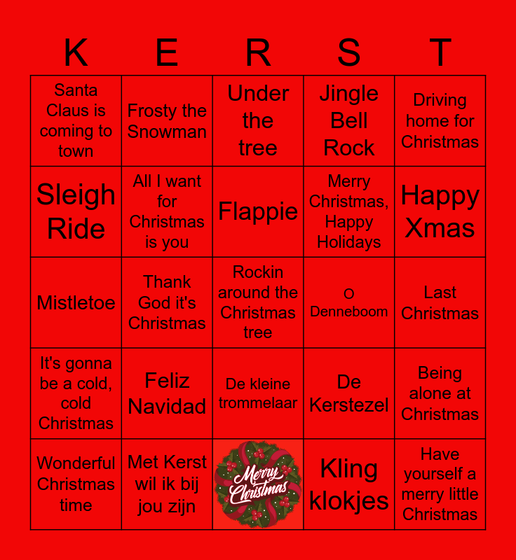 This bingo card has 1 images and 24 words: It's gonna be a cold, cold Christmas, Met Kerst wil ik bij jou zijn, Rockin around the Christmas tree, Kling klokjes, Driving home for Christmas, Santa Claus is coming to town, Frosty the Snowman, Under the tree, O Denneboom, Being alone at Christmas, Sleigh Ride, All I want for Christmas is you, De Kerstezel, Happy Xmas, Wonderful Christmas time, Thank God it's Christmas, Flappie, Merry Christmas, Happy Holidays, Last Christmas, Mistletoe, Feliz Navidad, De kleine trommelaar, Jingle Bell Rock and Have yourself a merry little Christmas.