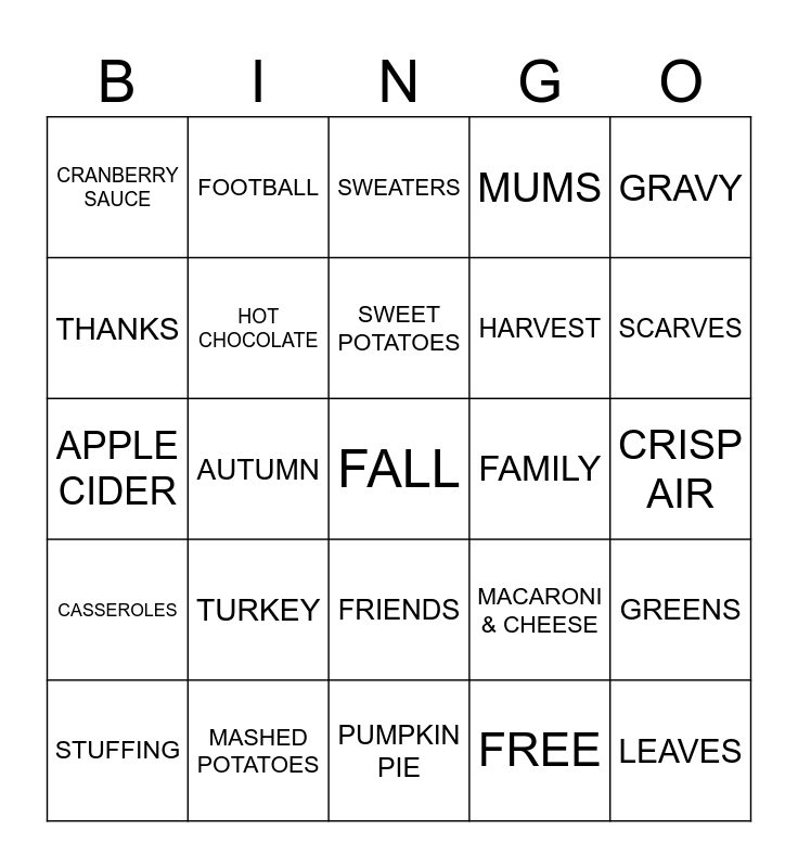 This bingo card has 25 words: TURKEY, PUMPKIN PIE, SWEET POTATOES, STUFFING, GRAVY, CRANBERRY SAUCE, THANKS, FOOTBALL, FAMILY, FRIENDS, HARVEST, APPLE CIDER, MACARONI & CHEESE, GREENS, HOT CHOCOLATE, LEAVES, CRISP AIR, SWEATERS, SCARVES, AUTUMN, FALL, MASHED POTATOES, CASSEROLES, MUMS and FREE.