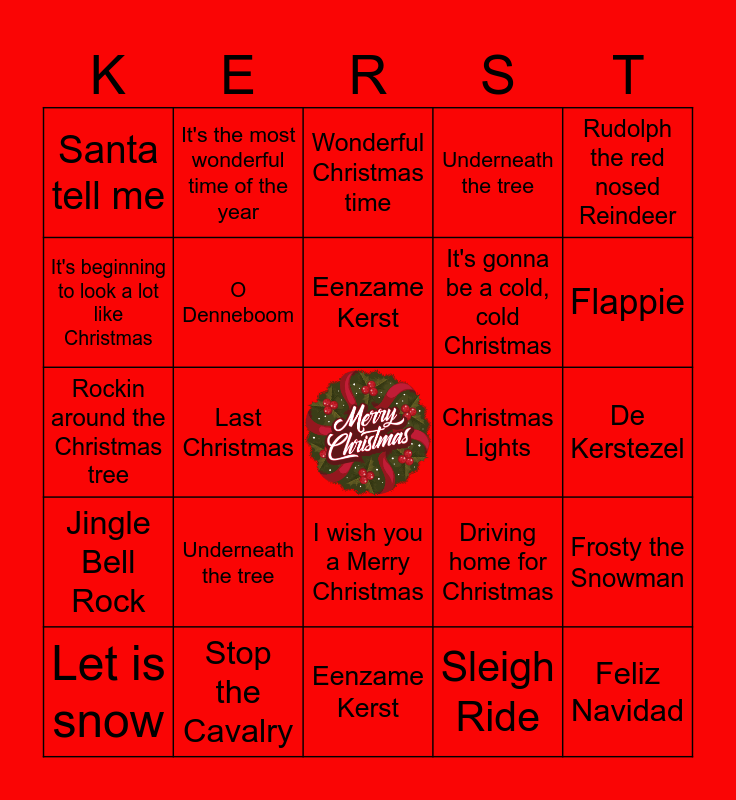 This bingo card has a free space and 24 words: Underneath the tree, Stop the Cavalry, Eenzame Kerst, Let is snow, Rudolph the red nosed Reindeer, Santa tell me, It's beginning to look a lot like Christmas, It's the most wonderful time of the year, Christmas Lights, I wish you a Merry Christmas, It's gonna be a cold, cold Christmas, Rockin around the Christmas tree, Driving home for Christmas, Frosty the Snowman, O Denneboom, Sleigh Ride, De Kerstezel, Wonderful Christmas time, Flappie, Last Christmas, Feliz Navidad, Jingle Bell Rock, Underneath the tree and Eenzame Kerst.