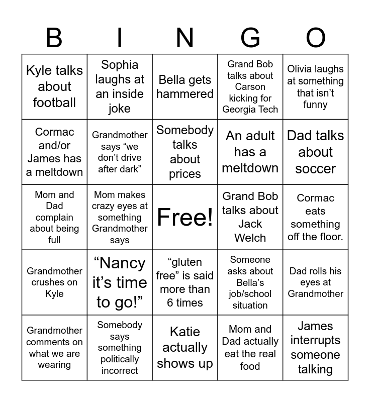 This bingo card has a free space and 24 words: Grandmother comments on what we are wearing, “Nancy it’s time to go!”, Somebody talks about prices, Mom and Dad actually eat the real food, Olivia laughs at something that isn’t funny, Kyle talks about football, Sophia laughs at an inside joke, Bella gets hammered, Grand Bob talks about Jack Welch, Cormac eats something off the floor., Mom and Dad complain about being full, Grandmother says “we don’t drive after dark”, Someone asks about Bella’s job/school situation, Dad rolls his eyes at Grandmother, Cormac and/or James has a meltdown, Somebody says something politically incorrect, Katie actually shows up, Grand Bob talks about Carson kicking for Georgia Tech, Dad talks about soccer, Grandmother crushes on Kyle, Mom makes crazy eyes at something Grandmother says, “gluten free” is said more than 6 times, An adult has a meltdown and James interrupts someone talking.