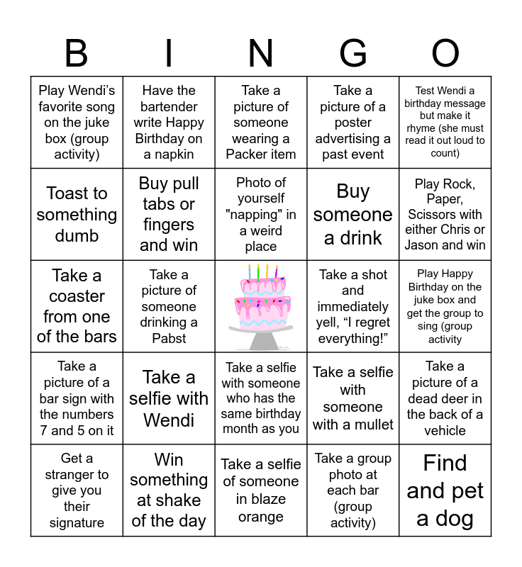 This bingo card has a free space and 24 words: Take a selfie with Wendi, Win something at shake of the day, Photo of yourself "napping" in a weird place, Get a stranger to give you their signature, Test Wendi a birthday message but make it rhyme (she must read it out loud to count), Play Wendi’s favorite song on the juke box (group activity), Toast to something dumb, Have the bartender write Happy Birthday on a napkin, Take a shot and immediately yell, “I regret everything!”, Take a selfie with someone who has the same birthday month as you, Buy someone a drink, Take a coaster from one of the bars, Take a selfie with someone with a mullet, Take a picture of a dead deer in the back of a vehicle, Buy pull tabs or fingers and win, Take a group photo at each bar (group activity), Play Happy Birthday on the juke box and get the group to sing (group activity, Take a picture of someone wearing a Packer item, Play Rock, Paper, Scissors with either Chris or Jason and win, Take a picture of someone drinking a Pabst, Find and pet a dog, Take a picture of a bar sign with the numbers 7 and 5 on it, Take a picture of a poster advertising a past event and Take a selfie of someone in blaze orange.