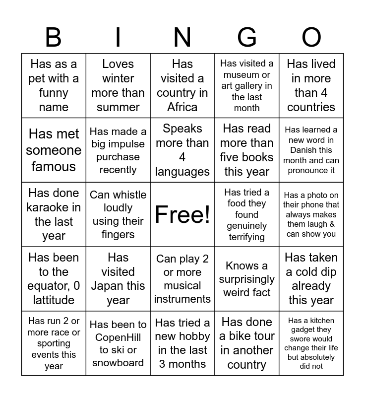 This bingo card has a free space and 25 words: Has visited Japan this year, Has tried a new hobby in the last 3 months, Speaks more than 4 languages, Has run 2 or more race or sporting events this year, Has lived in more than 4 countries, Has as a pet with a funny name, Has met someone famous, Loves winter more than summer, Has tried a food they found genuinely terrifying, Can play 2 or more musical instruments, Has read more than five books this year, Has done karaoke in the last year, Knows a surprisingly weird fact, Has taken a cold dip already this year, Has made a big impulse purchase recently, Has been to Tivoli in the last month, Has a photo on their phone that always makes them laugh & can show you, Has visited a country in Africa, Has learned a new word in Danish this month and can pronounce it, Can whistle loudly using their fingers, Has a kitchen gadget they swore would change their life but absolutely did not, Has been to CopenHill to ski or snowboard, Has been to the equator, 0 lattitude, Has visited a museum or art gallery in the last month and Has done a bike tour in another country.