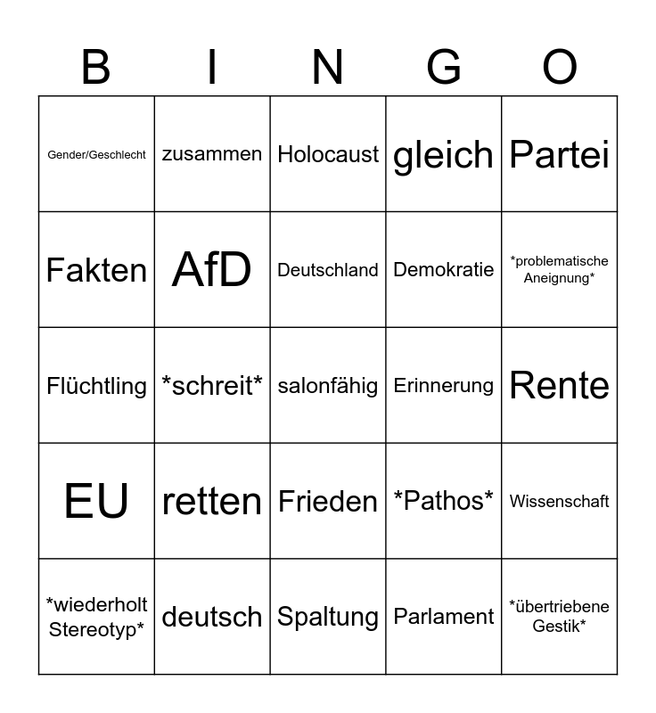 This bingo card has 40 words: *flüstert*, Flüchtling, Nationalsozialisten, AfD, deutsch, Frieden, Deutschland, Wahlen, Partei, EU, *schreit*, gleich, salonfähig, Rente, Erinnerung, retten, Haltung, Gender/Geschlecht, frei, Holocaust, Wissenschaft, Parlament, Demokratie, Fakten, Krieg, Verantwortung, Meinungsfreiheit, *rhetorische Frage*, *übertriebene Gestik*, Volk, Lehre aus der Geschichte, *wiederholt Stereotyp*, die Schwachen, *Pathos*, *problematische Aneignung*, Spaltung, Riss, Diskurs, zusammen and überwinden.