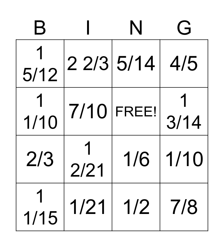 This bingo card has 18 words: 1 2/21, 7/8, 5/14, 1 5/12, 1/6, 4/5, 1 1/15, 2 2/3, 1 3/14, 2/3, 1/2, 1 1/10, 1/10, 7/10, FREE!, 1 1/12, 1/21 and 3/14.