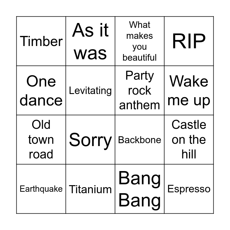 This bingo card has 37 words: California Gurls, Super Bass, OMG, Party rock anthem, Somebody that I used to know, Call me maybe, Wake me up, Let it go, One dance, Uptown funk, Castle on the hill, RIP, Earthquake, Bang Bang, Levitating, Espresso, Glad you came, What makes you beautiful, Time of our lives, Titanium, Timber, Sorry, Feel so close, Shut up and dance, She makes me wanna, Blinding lights, As it was, Stick season, We are young, Airplanes, Love the way you lie, Teenage dream, Backbone, We found love, Can’t hold us, Old town road and Ordinary.