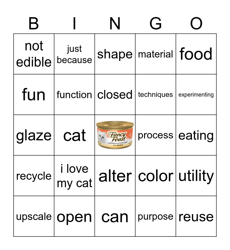 This bingo card has a free space and 24 words: i love my cat, open, closed, upscale, food, not edible, fun, just because, process, alter, techniques, glaze, color, utility, function, purpose, eating, shape, experimenting, cat, reuse, recycle, material and can.