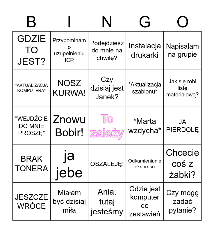 This bingo card has a free space and 24 words: ja jebe, Miałam być dzisiaj miła, Czy dzisiaj jest Janek?, JESZCZE WRÓCĘ, Napisałam na grupie, GDZIE TO JEST?, *AKTUALIZACJA KOMPUTERA*, Przypominam o uzupełnieniu ICP, *Marta wzdycha*, OSZALEJĘ!, *Aktualizacja szablonu*, "WEJDŹCIE DO MNIE PROSZĘ", Odkamienianie ekspresu, Chcecie coś z żabki?, NOSZ KURWA!, Gdzie jest komputer do zestawień, JA PIERDOLĘ, Podejdziesz do mnie na chwilę?, Jak się robi listę materiałową?, Znowu Bobir!, Czy mogę zadać pytanie?, BRAK TONERA, Instalacja drukarki and Ania, tutaj jesteśmy.
