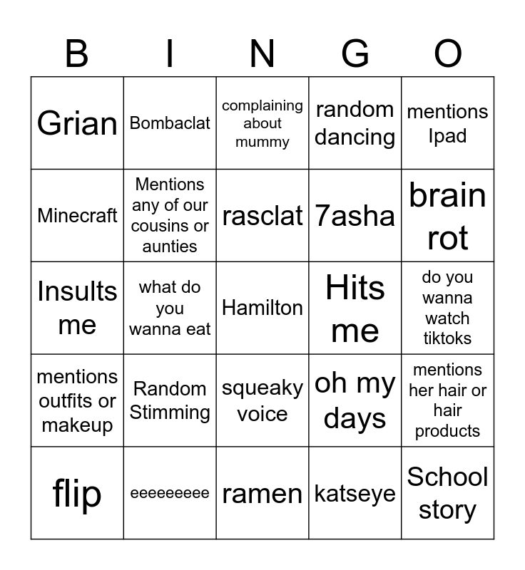 This bingo card has a free space and 24 words: Random Stimming, eeeeeeeee, rasclat, flip, mentions Ipad, Grian, Minecraft, Bombaclat, Hits me, squeaky voice, 7asha, Insults me, oh my days, mentions her hair or hair products, Mentions any of our cousins or aunties, katseye, do you wanna watch tiktoks, complaining about mummy, brain rot, what do you wanna eat, School story, mentions outfits or makeup, random dancing and ramen.