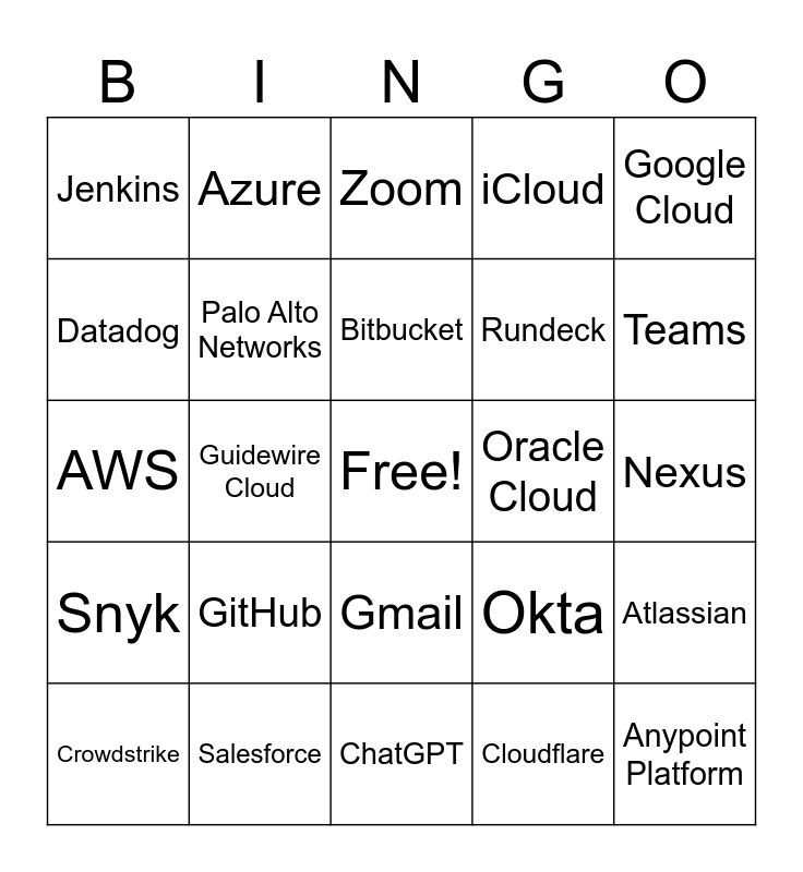 This bingo card has a free space and 24 words: GitHub, Salesforce, Bitbucket, Crowdstrike, Google Cloud, Jenkins, Datadog, Azure, Oracle Cloud, Gmail, Rundeck, AWS, Okta, Atlassian, Palo Alto Networks, Cloudflare, Nexus, Zoom, Teams, Guidewire Cloud, Anypoint Platform, Snyk, iCloud and ChatGPT.