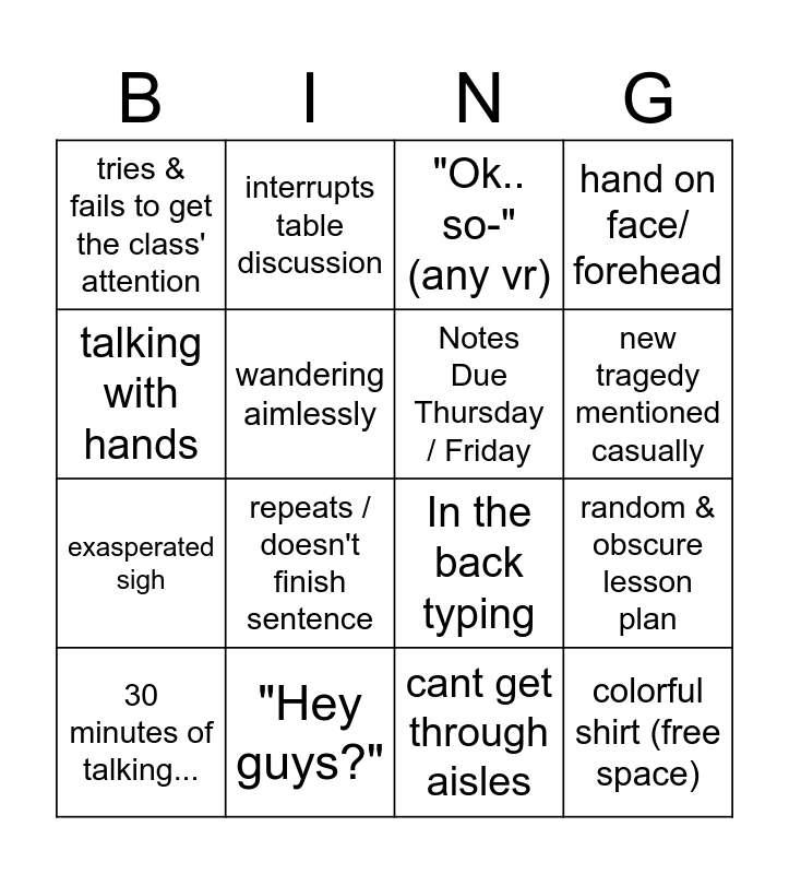 This bingo card has 16 words: "Hey guys?", random & obscure lesson plan, "Ok.. so-" (any vr), tries & fails to get the class' attention, exasperated sigh, interrupts table discussion, In the back typing, cant get through aisles, talking with hands, wandering aimlessly, 30 minutes of talking..., hand on face/ forehead, repeats / doesn't finish sentence, new tragedy mentioned casually, Notes Due Thursday / Friday and colorful shirt (free space).