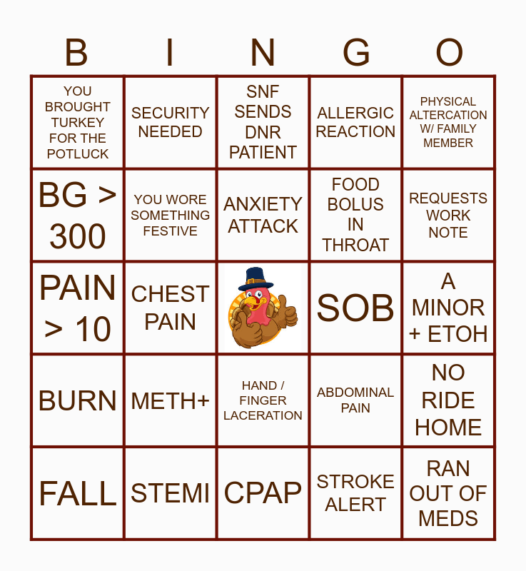 This bingo card has a free space and 39 words: OVERDOSE, FOOD POISONING, PITTING EDEMA, YOU WORE SOMETHING FESTIVE, FALL, HAND / FINGER LACERATION, ANXIETY ATTACK, ETOH >250, PHYSICAL ALTERCATION W/ FAMILY MEMBER, BURN, CHEST PAIN, ALLERGIC REACTION, RAN OUT OF MEDS, A MINOR + ETOH, SOB, METH+, GI BLEED, YOU BROUGHT TURKEY FOR THE POTLUCK, AMA, ABDOMINAL PAIN, BG > 300, CPAP, FOOD BOLUS IN THROAT, REQUESTS WORK NOTE, YOU ARE A VEGETARIAN, TROP > 100, 3+ ER VISITS WITHIN THE PAST MONTH, CARDIO-VERSION, ESI 5, SECURITY NEEDED, PROCEDURAL SEDATION, ELOPEMENT, SNF SENDS DNR PATIENT, STEMI, STROKE ALERT, NEEDS INTERPRETER MACHINE, NO RIDE HOME, PAIN > 10 and GIVES A PT CRUTCHES.