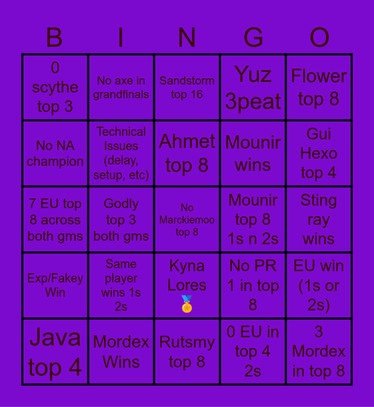 This bingo card has a free space and 24 words: Same player wins 1s 2s, Mordex Wins, Ahmet top 8, Java top 4, Flower top 8, 0 scythe top 3, No NA champion, No axe in grandfinals, Mounir top 8 1s n 2s, Kyna Lores 🏅, Mounir wins, 7 EU top 8 across both gms, No PR 1 in top 8, EU win (1s or 2s), Technical Issues (delay, setup, etc), 0 EU in top 4 2s, Sting ray wins, Sandstorm top 16, Gui Hexo top 4, Godly top 3 both gms, 3 Mordex in top 8, Exp/Fakey Win, Yuz 3peat and Rutsmy top 8.