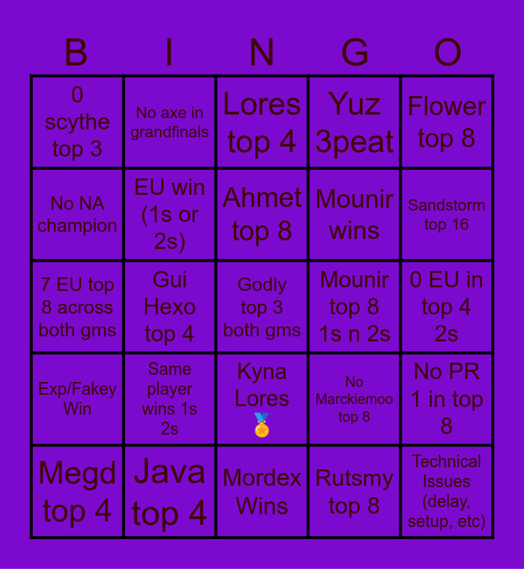 This bingo card has 25 words: Same player wins 1s 2s, Mordex Wins, Ahmet top 8, Megd top 4, Flower top 8, 0 scythe top 3, No NA champion, No axe in grandfinals, Mounir top 8 1s n 2s, Kyna Lores 🏅, Mounir wins, 7 EU top 8 across both gms, No Marckiemoo top 8, No PR 1 in top 8, EU win (1s or 2s), Technical Issues (delay, setup, etc), 0 EU in top 4 2s, Lores top 4, Sandstorm top 16, Gui Hexo top 4, Godly top 3 both gms, Java top 4, Exp/Fakey Win, Yuz 3peat and Rutsmy top 8.