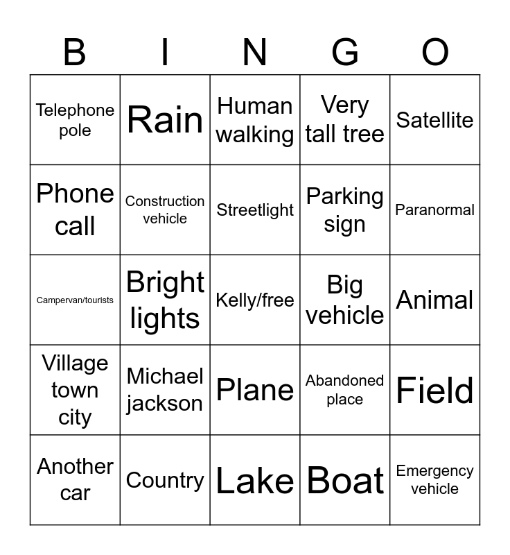 This bingo card has a free space and 24 words: Michael jackson, Country, Streetlight, Another car, Satellite, Telephone pole, Phone call, Rain, Big vehicle, Plane, Parking sign, Campervan/tourists, Abandoned place, Field, Construction vehicle, Boat, Animal, Human walking, Paranormal, Bright lights, Emergency vehicle, Village town city, Very tall tree and Lake.