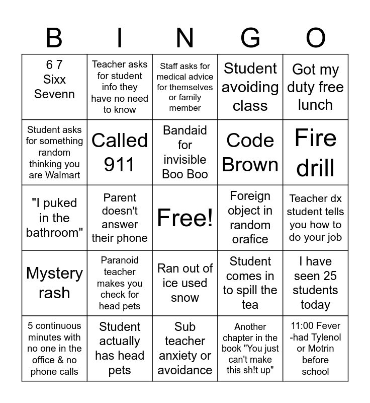 This bingo card has a free space and 24 words: Paranoid teacher makes you check for head pets, Student actually has head pets, Bandaid for invisible Boo Boo, 5 continuous minutes with no one in the office & no phone calls, Got my duty free lunch, 6 7 Sixx Sevenn, Student asks for something random thinking you are Walmart, Teacher asks for student info they have no need to know, Foreign object in random orafice, Ran out of ice used snow, Code Brown, "I puked in the bathroom", Student comes in to spill the tea, I have seen 25 students today, Called 911, Another chapter in the book "You just can't make this sh!t up", Teacher dx student tells you how to do your job, Staff asks for medical advice for themselves or family member, Fire drill, Parent doesn't answer their phone, 11:00 Fever -had Tylenol or Motrin before school, Mystery rash, Student avoiding class and Sub teacher anxiety or avoidance.