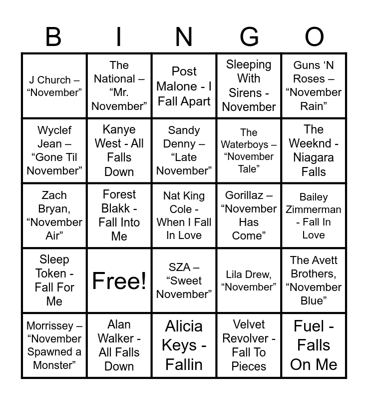 This bingo card has 25 words: Free!, Alicia Keys - Fallin, Sandy Denny – “Late November”, Morrissey – “November Spawned a Monster”, Guns ‘N Roses – “November Rain”, J Church – “November”, Wyclef Jean – “Gone Til November”, The National – “Mr. November”, Gorillaz – “November Has Come”, SZA – “Sweet November”, The Waterboys – “November Tale”, Zach Bryan, “November Air”, Lila Drew, “November”, The Avett Brothers, “November Blue”, Kanye West - All Falls Down, Fuel - Falls On Me, Bailey Zimmerman - Fall In Love, Post Malone - I Fall Apart, The Weeknd - Niagara Falls, Forest Blakk - Fall Into Me, Nat King Cole - When I Fall In Love, Alan Walker - All Falls Down, Sleep Token - Fall For Me, Sleeping With Sirens - November and Velvet Revolver - Fall To Pieces.