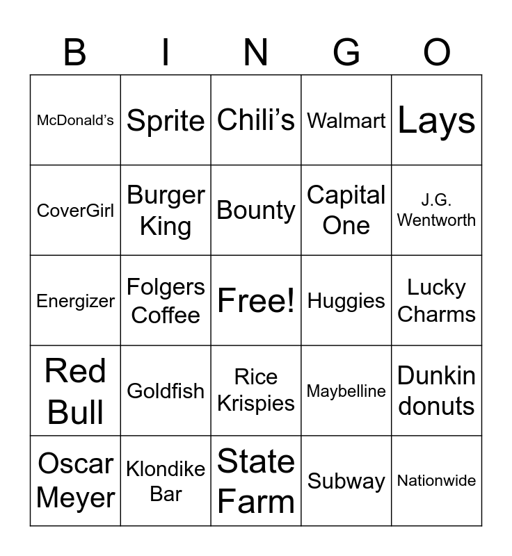 This bingo card has a free space and 29 words: Oscar Meyer, Toys R US, Folgers Coffee, Kit Kat, McDonald’s, Chili’s, Burger King, Goldfish, Huggies, Klondike Bar, Lucky Charms, Nationwide, State Farm, Subway, J.G. Wentworth, Meow Mix, Rice Krispies, Red Bull, Lays, Energizer, Maybelline, Taco Bell, Capital One, CoverGirl, Walmart, Sprite, Dunkin donuts, Bounty and Verizon.