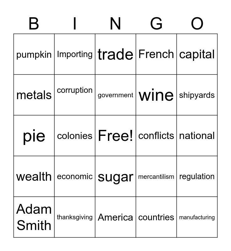 This bingo card has a free space and 24 words: Adam Smith, economic, government, countries, capital, pumpkin, Importing, trade, conflicts, national, pie, corruption, mercantilism, regulation, metals, thanksgiving, America, French, shipyards, wealth, colonies, sugar, wine and manufacturing.