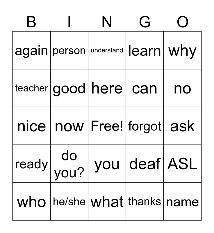 This bingo card has a free space and 29 words: who, when, now, fun, again, understand, good, do you?, forgot, he/she, ask, name, what, thanks, no, me/I, you, ready, why, nice, deaf, heard of hearing, can, teacher, learn, person, ASL, here and like.